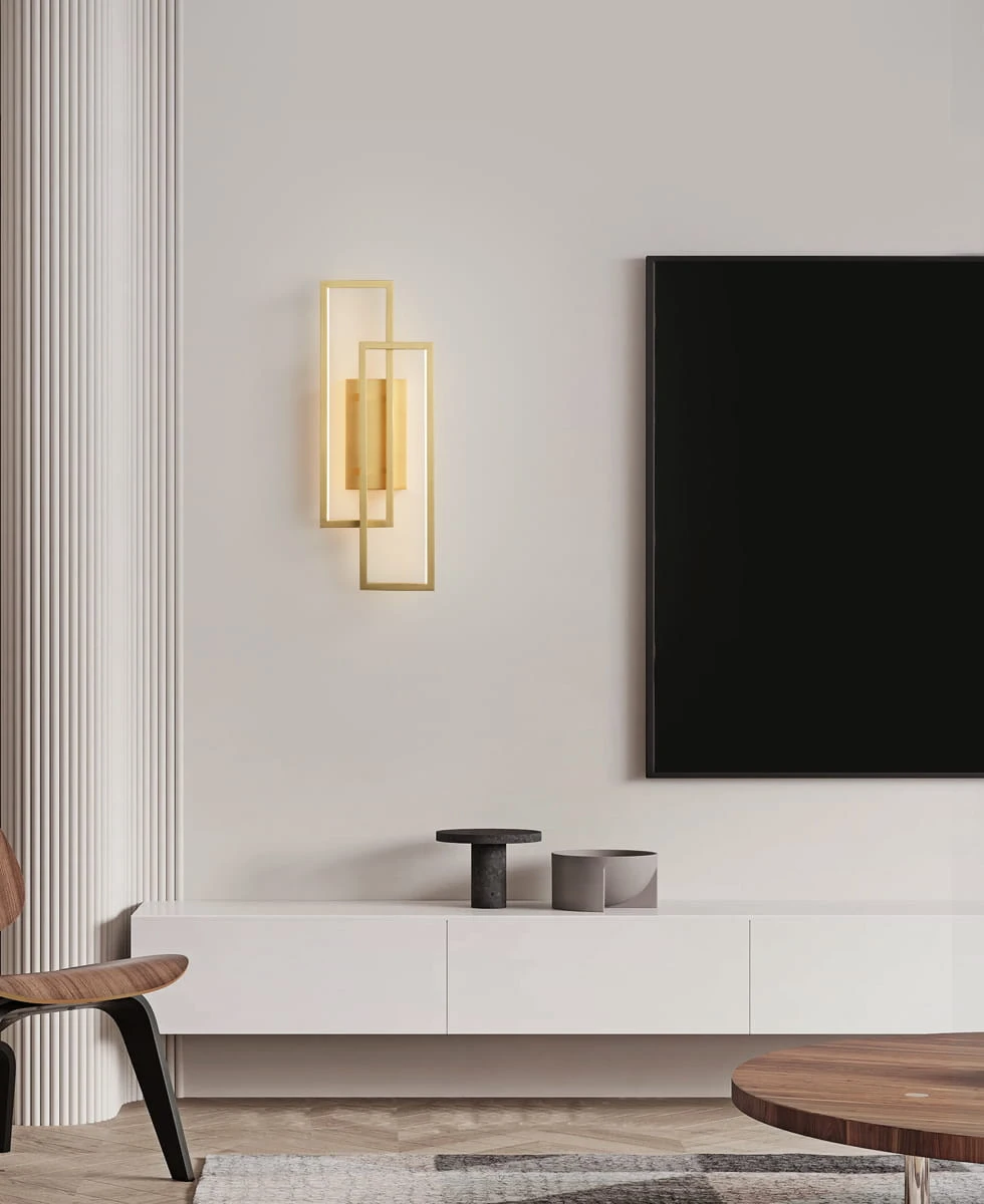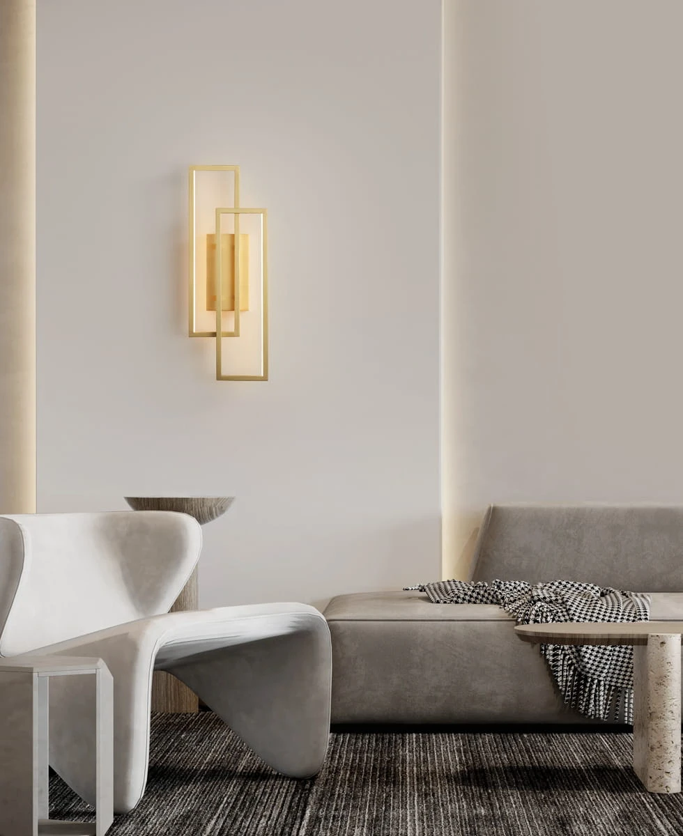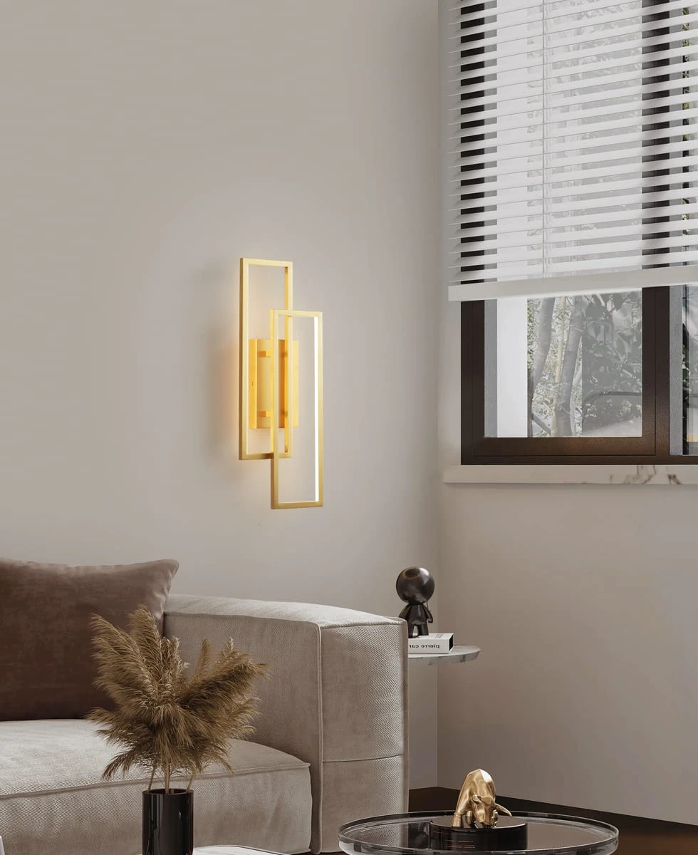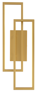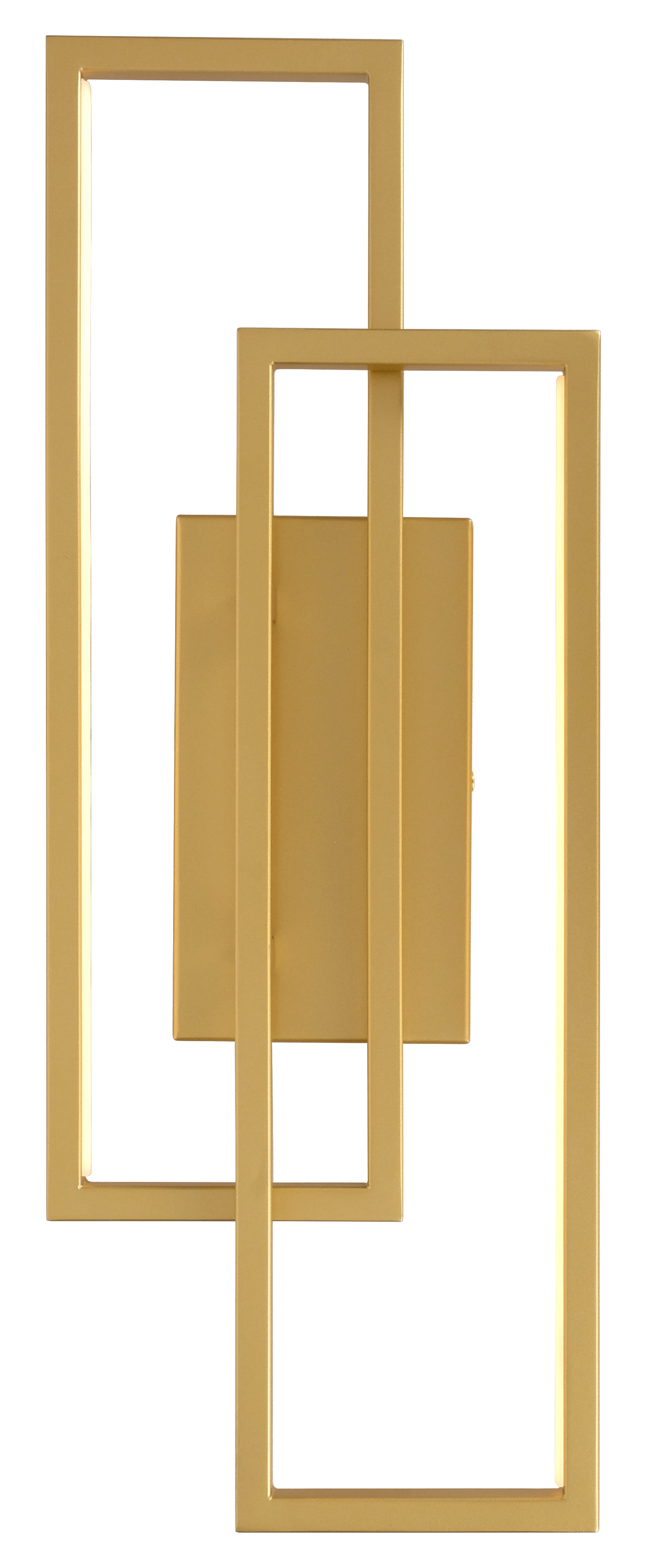 SQR Dos to nowoczesny kinkiet LED o mocnym, geometrycznym charakterze. Podwójna, prostokątna konstrukcja w kolorze złotym tworzy wyrazistą formę dekoracyjną, która świetnie pasuje do wnętrz minimalistycznych i nowoczesnych. Zintegrowane źródło LED o ciepłej barwie 3000K zapewnia komfortowe światło, idealne do korytarza, salonu lub jako eleganckie oświetlenie ściany akcentowej.